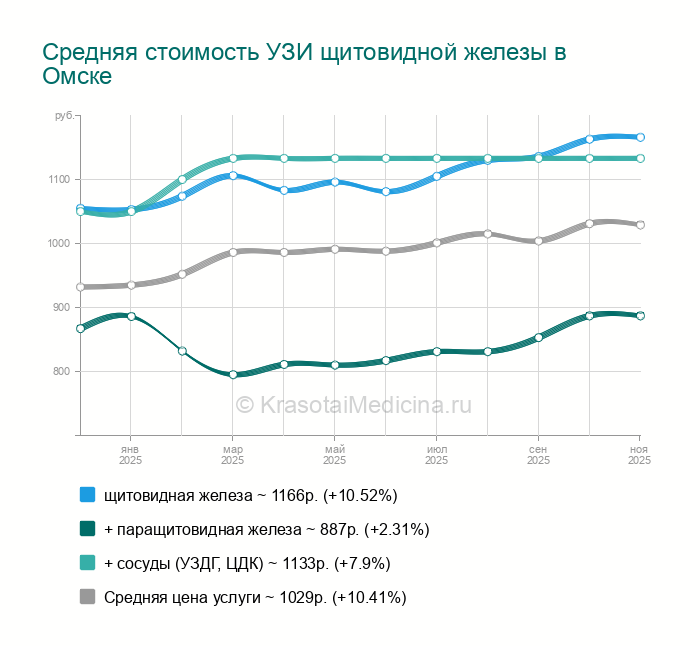 Сделать УЗИ щитовидной железы в Омске можно в 103 клиниках. Средняя цена - 1037р. (+2.17% за последние 3 месяца). Всего найдено 114 цен от 31 до 4800 руб.