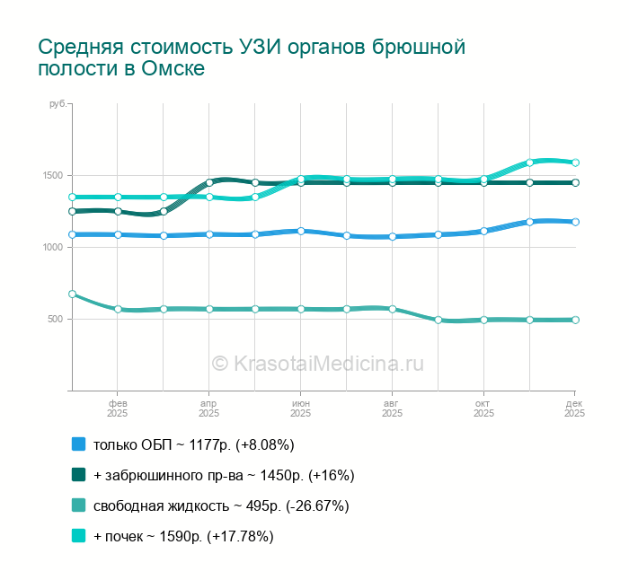 Сделать УЗИ органов брюшной полости в Омске можно в 81 клинике. Средняя цена - 1185р. (+7.24% за последние 3 месяца). Всего найдена 101 цена от 300 до 2000 руб.