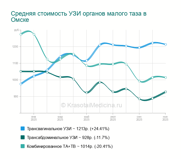 Сделать УЗИ органов малого таза у женщин в Омске можно в 74 клиниках. Средняя цена - 1094р. (-5.45% за последние 3 месяца). Всего найдено 138 цен от 250 до 1800 руб.