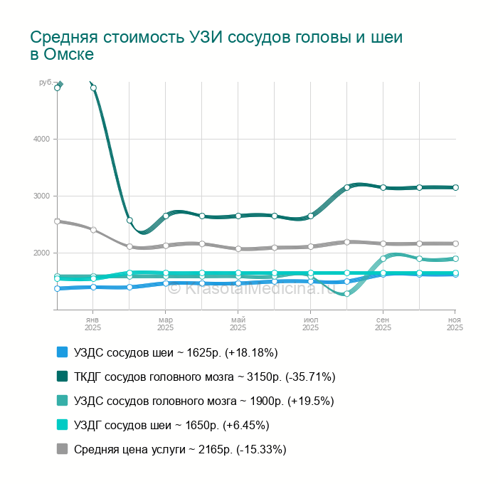 Сделать УЗИ сосудов головы и шеи в Омске можно в 26 клиниках. Средняя цена - 2168р. (+6.07% за последние 3 месяца). Всего найдено 35 цен от 1000 до 5200 руб.